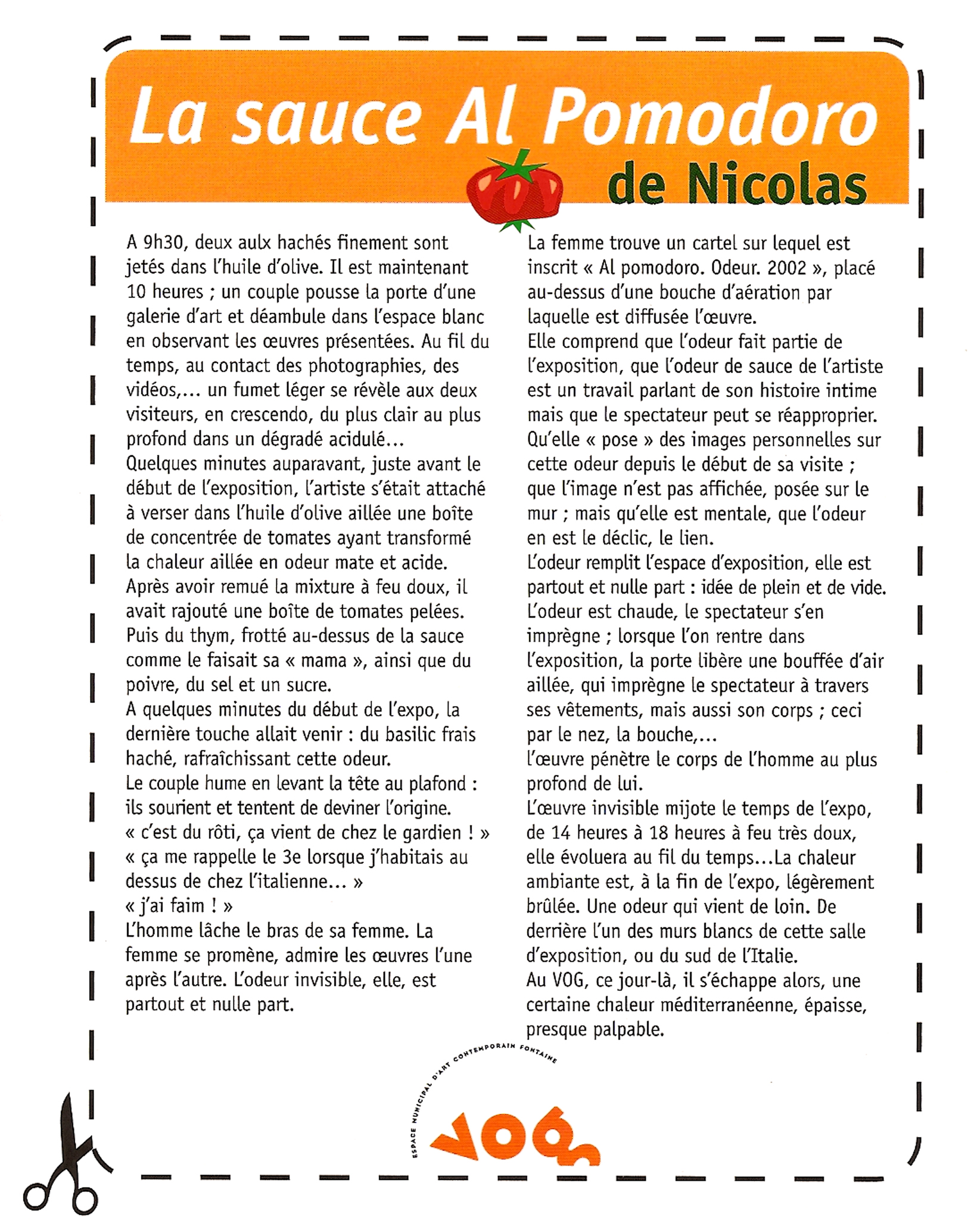 “Fiche cuisine” détachable accompagnant le catalogue de mon exposition personnelle au VOG (Fontaine), 2006. La pièce olfactive est présentée à travers une fiction.