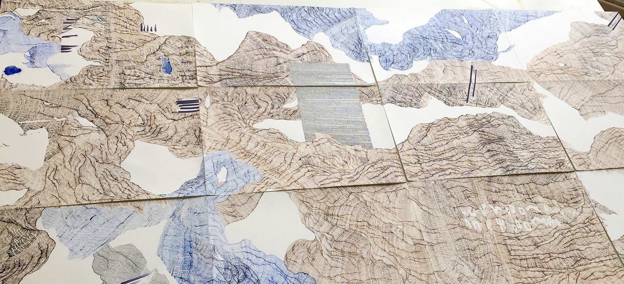 À partir de notes de lecture (Henri Michaux, Jean-Luc Nancy, Felix Bruly-Bouabre, Jean Paulhan, Laurence Sterne, …), mais aussi de tâches (car les feuilles m’ont servi aussi à essuyer mes pinceaux), Je compose des dessins à partir de notes prises dans les archives présentées dans l’exposition Singuliers.