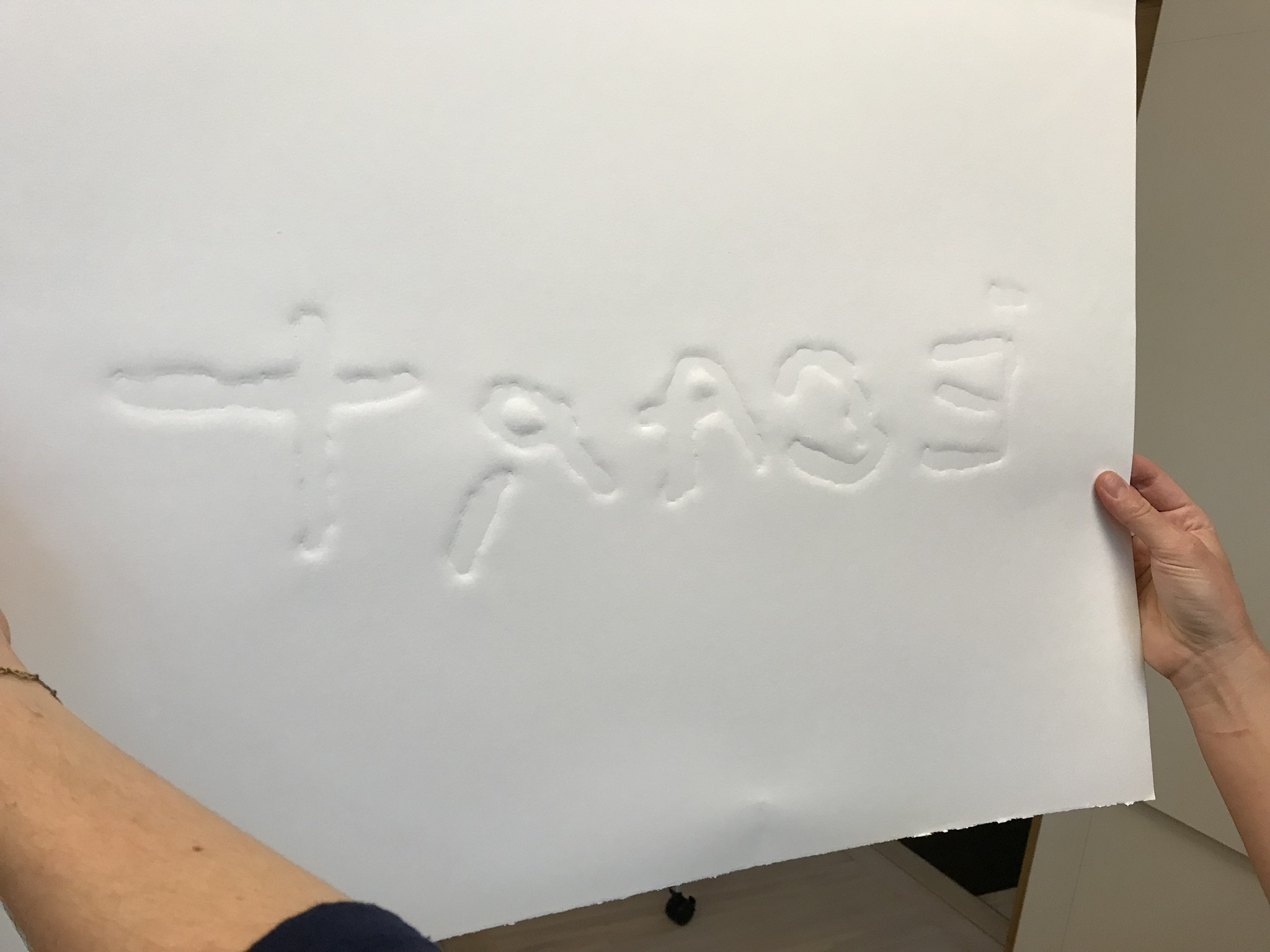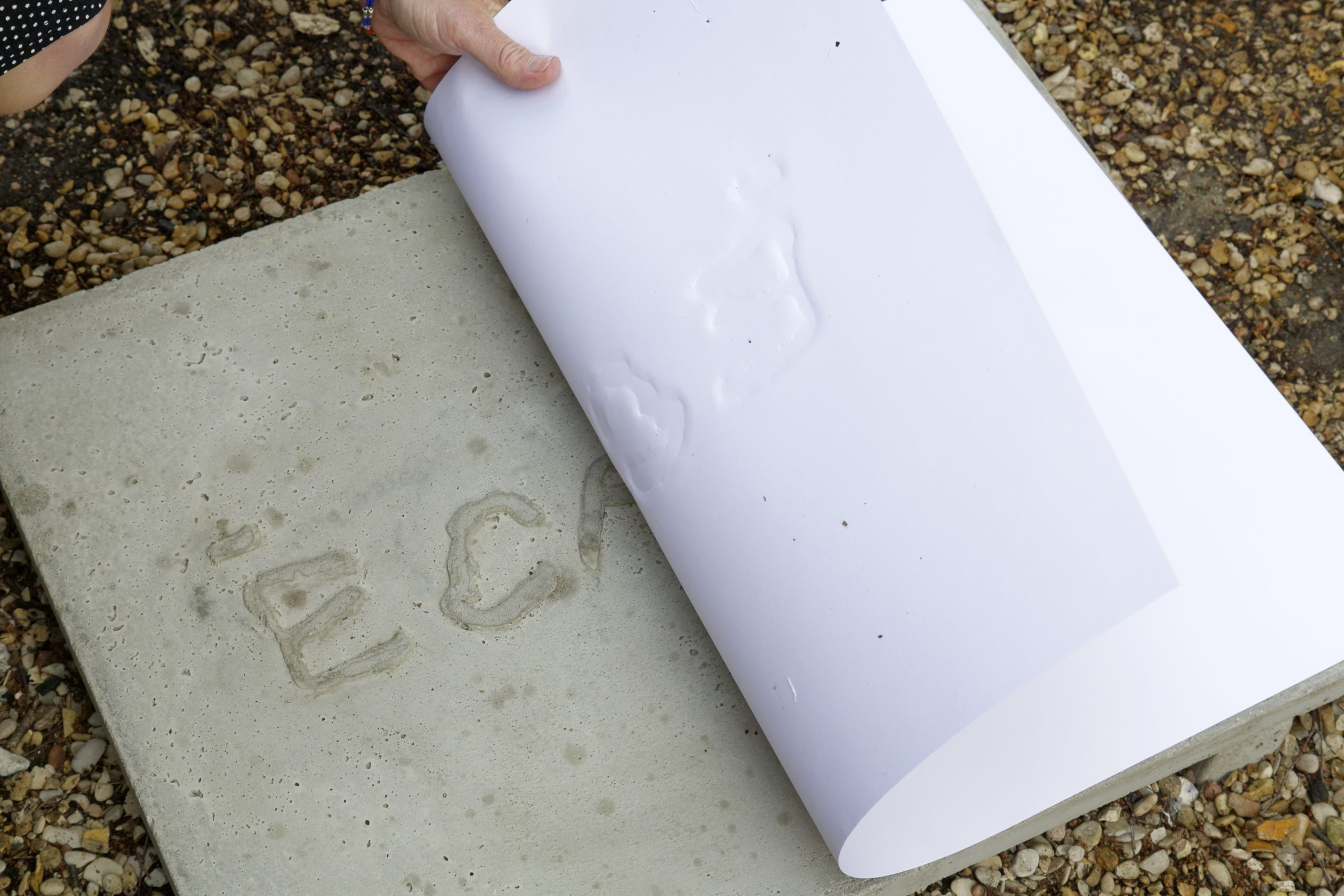 Sur une plaque de béton brut, est inscrit le mot « Écart » en relief. Les regardeurs sont invités à y poser une feuille de papier afin de relever une empreinte du mot qui devient, en miroir : « tracÉ ». Ils peuvent alors emporter avec eux l’estampe réalisée par leurs soins.