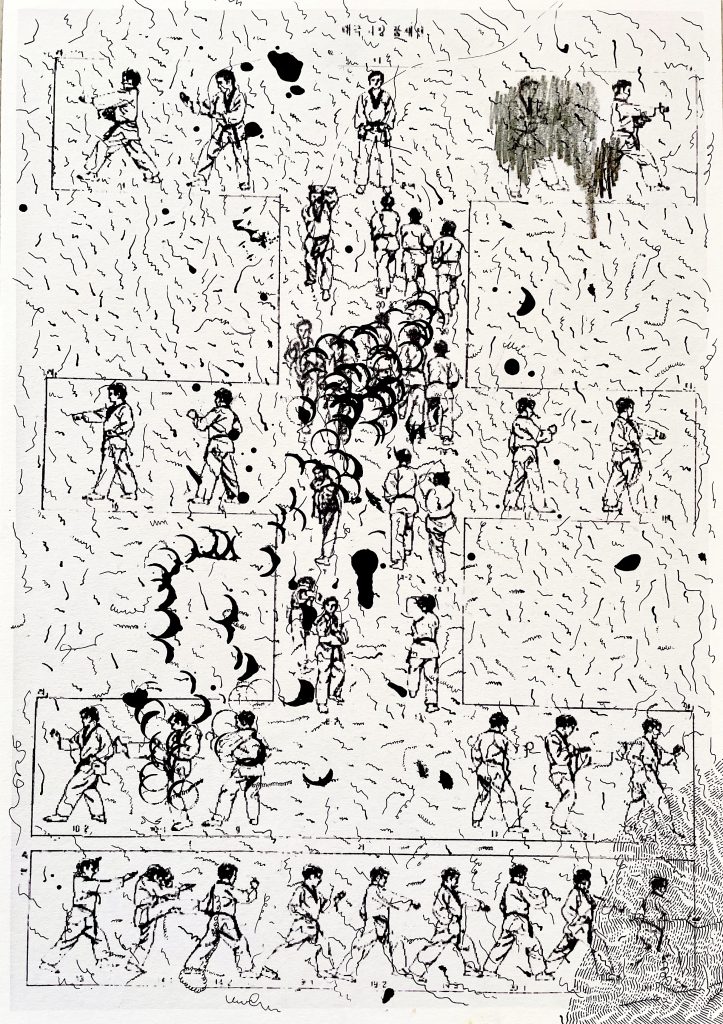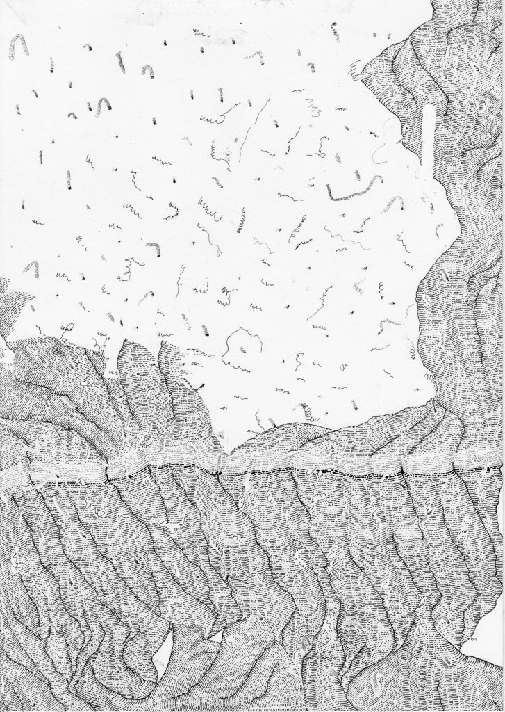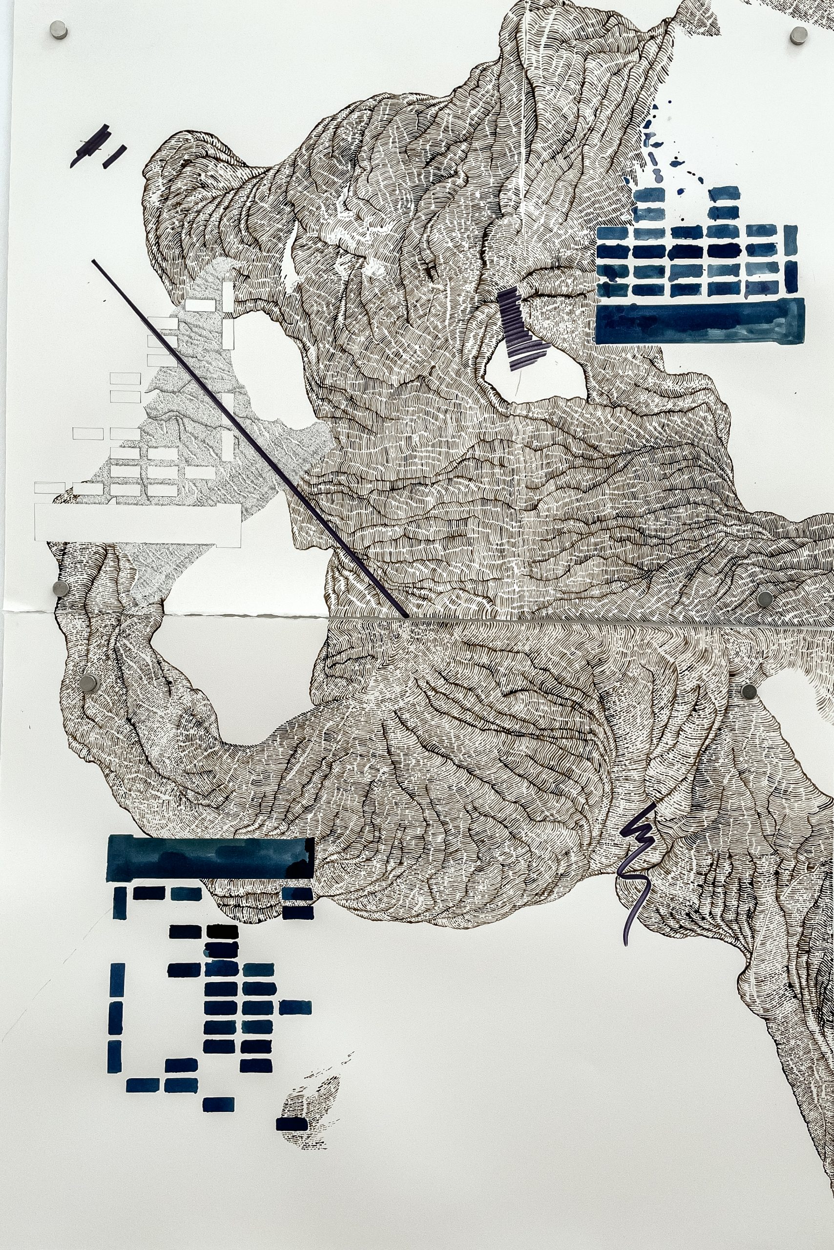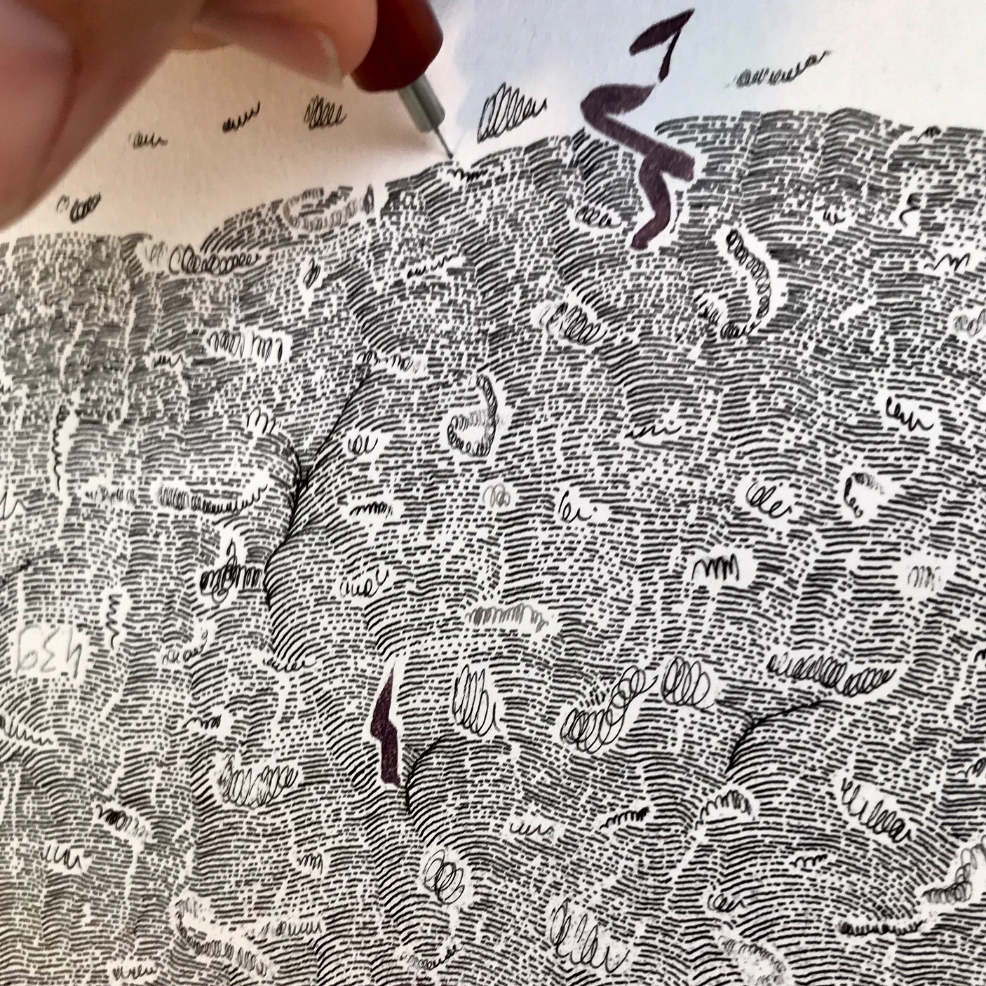 Ces dessins forment un dialogue entre des gestes aléatoires (que je fais pour tester mes stylos et mon encre) et les rehausses que je rajoutent pour réaliser ces compositions graphiques.