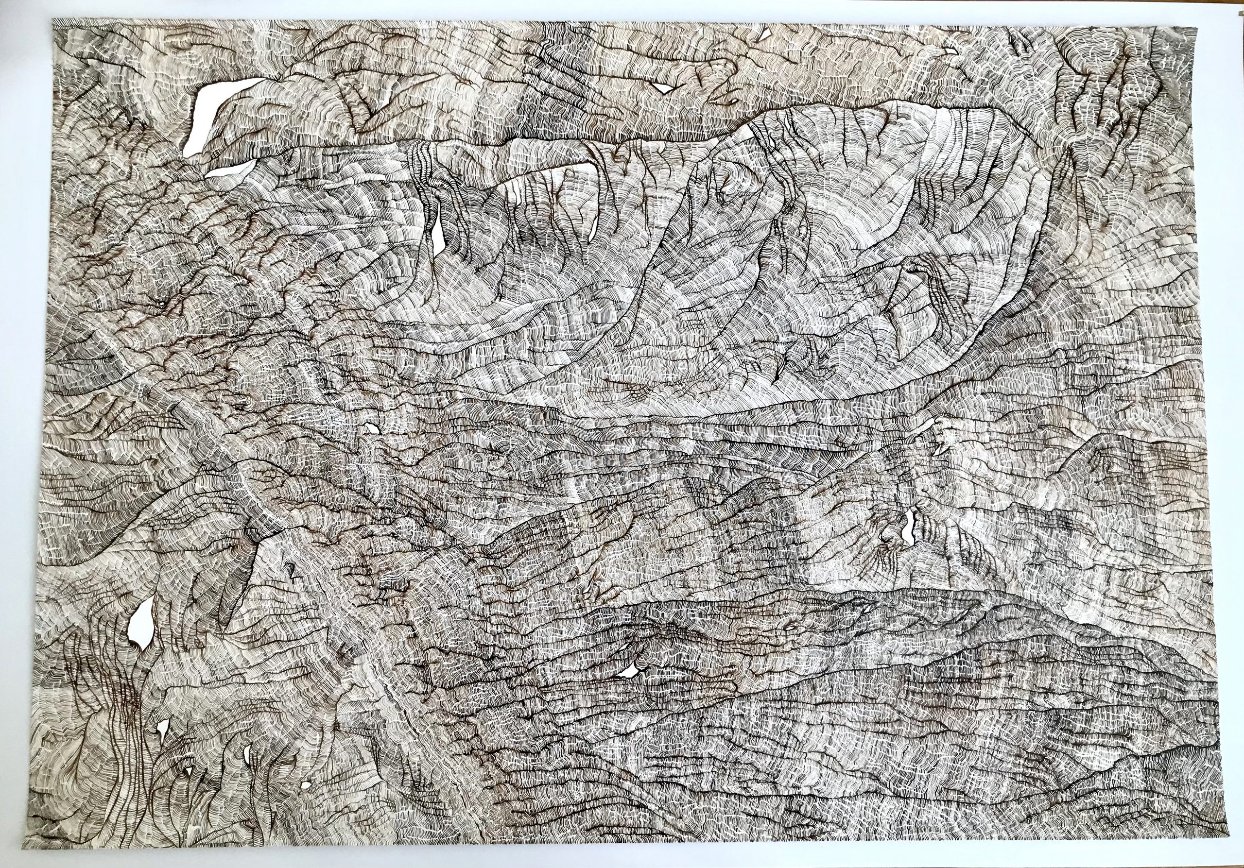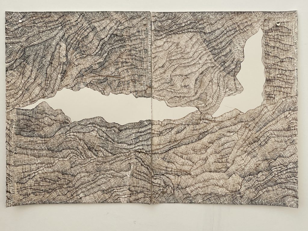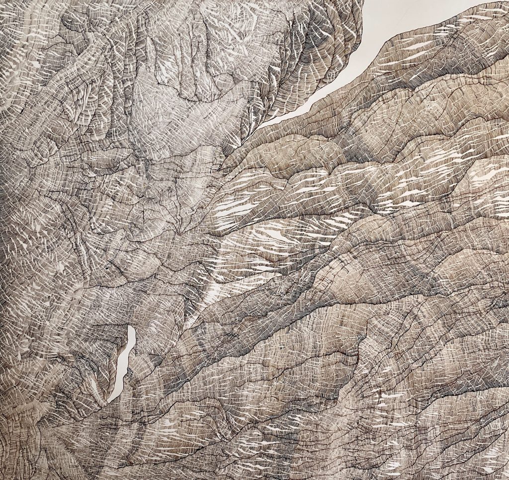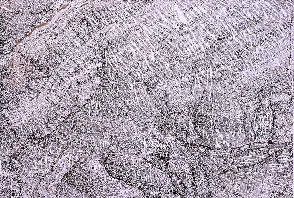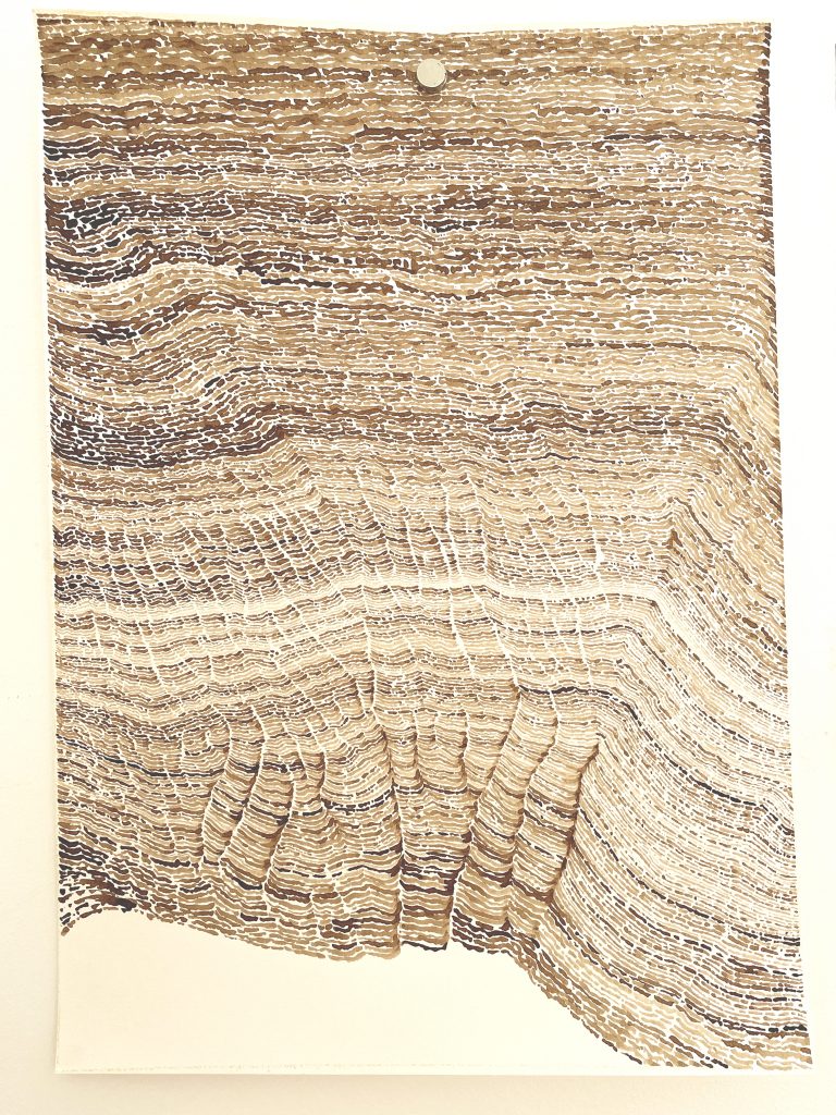 Par le fait de tracer, de suivre la ligne précédente, de répéter ce geste, se créent des mondes dont je n’ai aucune idée de la forme qu’ils prendront. Le résultat apparait sous mes yeux, ces mondes évoquent la nature et sa construction dans les strates du temps (lichens, roches, bois, …). Ici, j’inscris ces lignes au brou de noix. Le brou de noix inscrit également le temps par la couleur. En effet, les pigments, qui s’empâtent avec le temps, créent une couleur plus sombre (par les heures qui passent à travailler à l’atelier mais aussi par la chaleur de l’été ou par le froid de l’hiver, le climat agit directement sur la couleur du dessin). La couleur marque le temps (par exemple, lorsque je travaille le matin, la couleur est plus claire et plus j’avance dans la journée, plus le brou de noix s’empâte, la couleur devient plus sombre). La couleur du dessin témoigne aussi de ce temps de création.