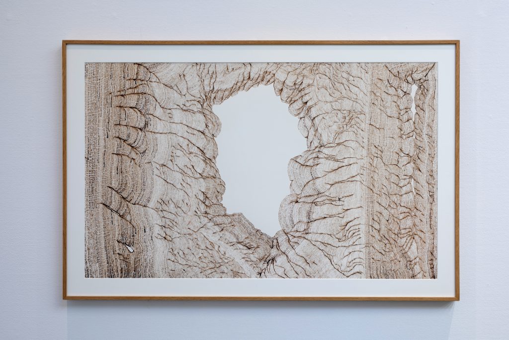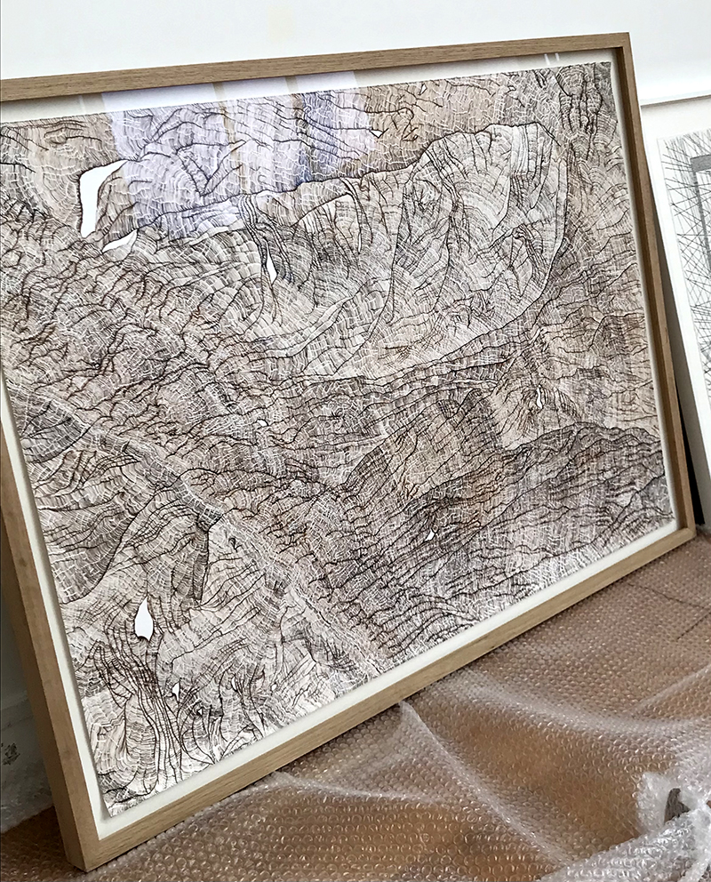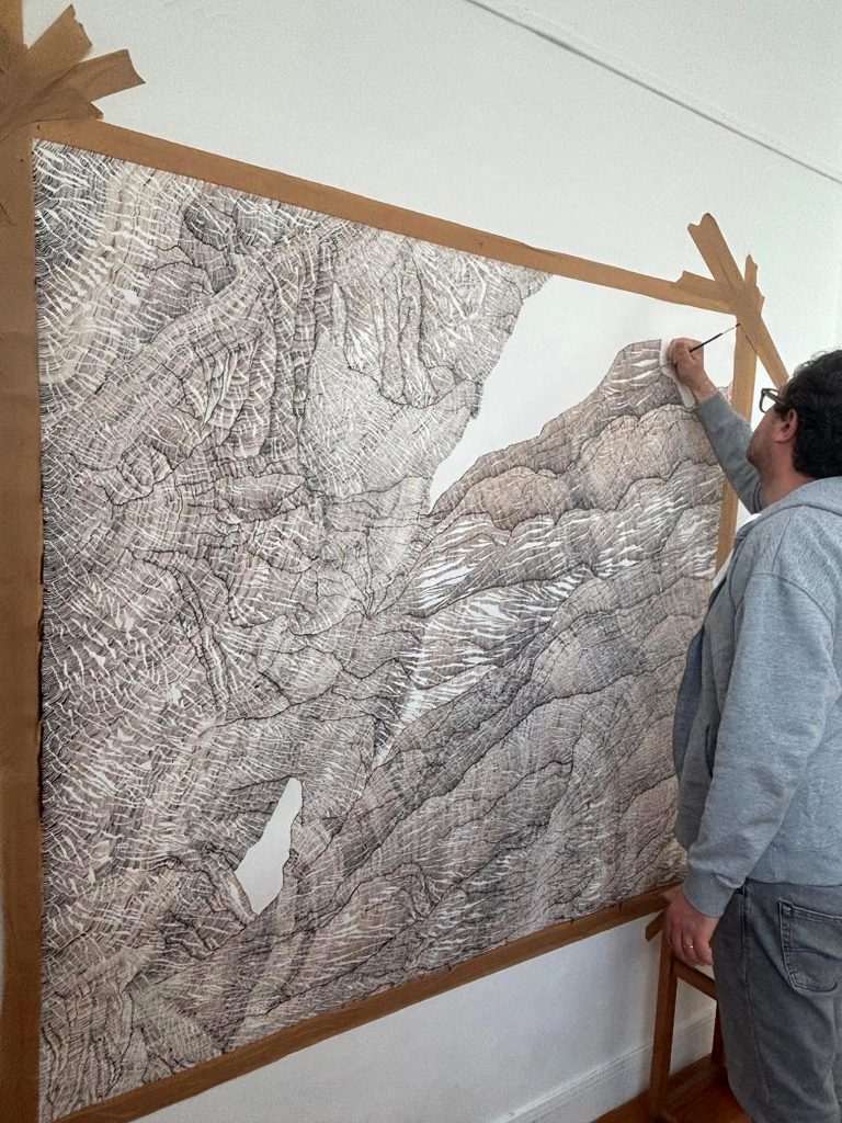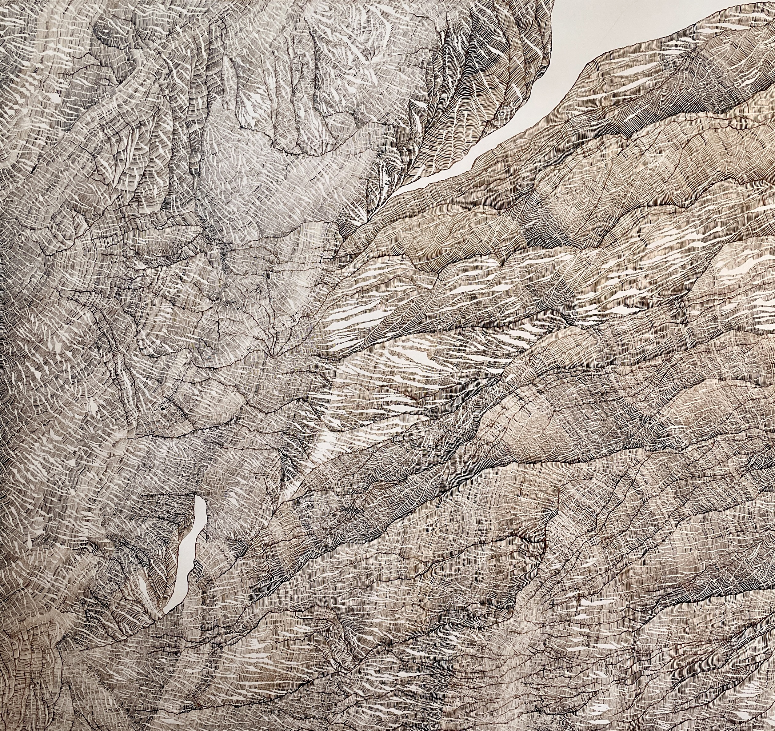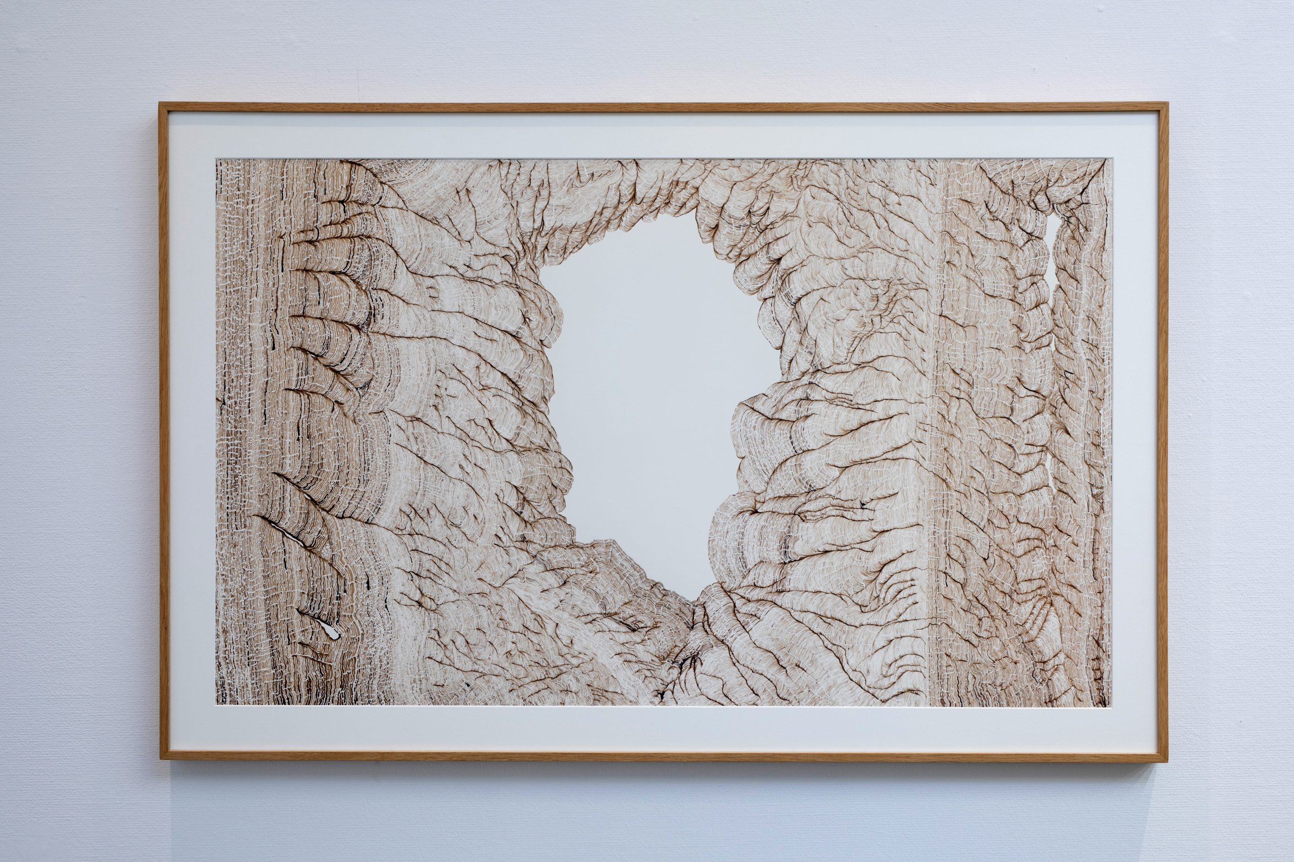 Par le fait de tracer, de suivre la ligne précédente, de répéter ce geste, se créent des mondes dont je n’ai aucune idée de la forme qu’ils prendront. Le résultat apparait sous mes yeux, ces mondes évoquent la nature et sa construction dans les strates du temps (lichens, roches, bois, …). Ici, j’inscris ces lignes au brou de noix. Le brou de noix inscrit également le temps par la couleur. En effet, les pigments, qui s’empâtent avec le temps, créent une couleur plus sombre (par les heures qui passent à travailler à l’atelier mais aussi par la chaleur de l’été ou par le froid de l’hiver, le climat agit directement sur la couleur du dessin). La couleur marque le temps (par exemple, lorsque je travaille le matin, la couleur est plus claire et plus j’avance dans la journée, plus le brou de noix s’empâte, la couleur devient plus sombre). La couleur du dessin témoigne aussi de ce temps de création.