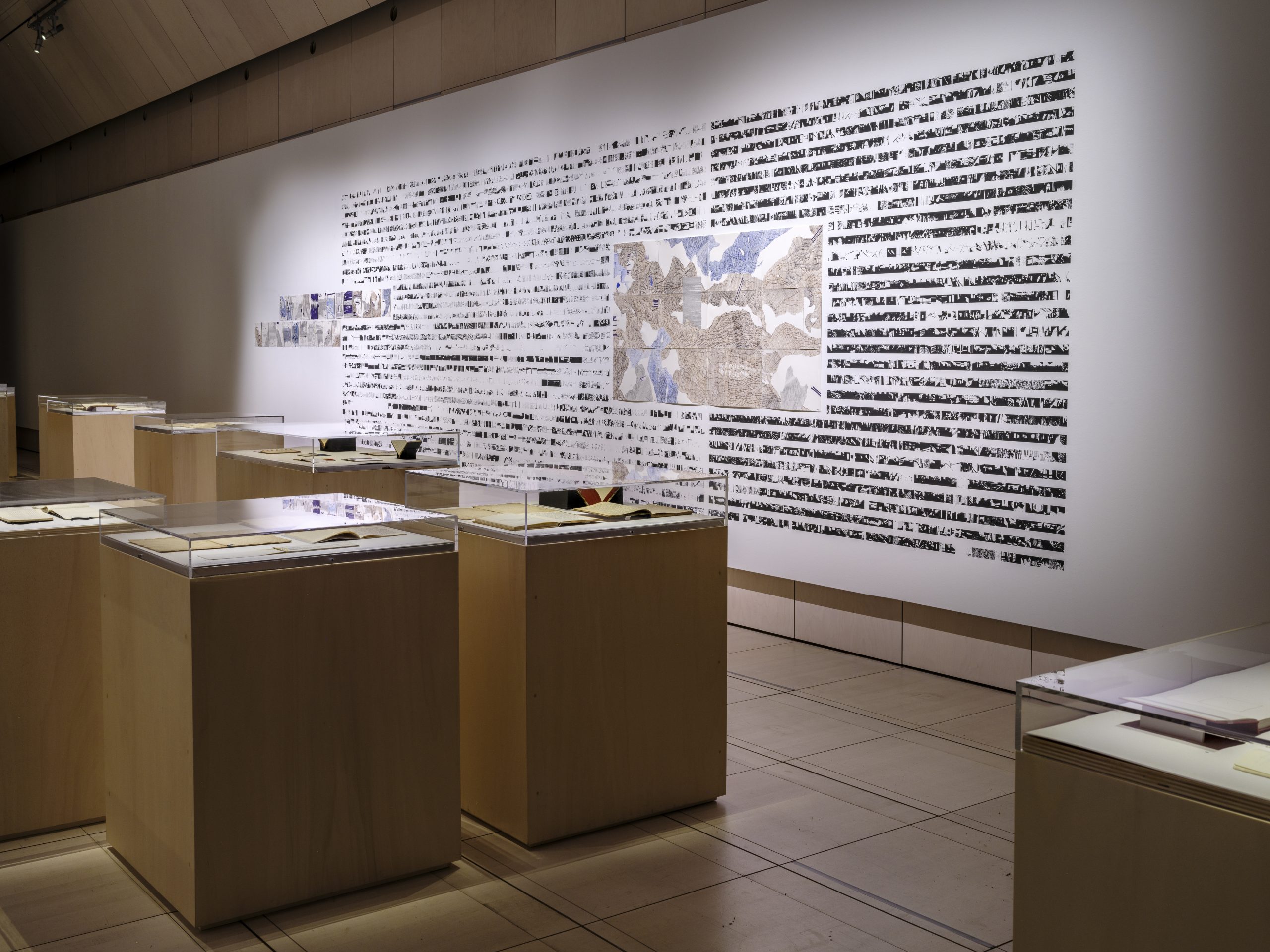 La longue composition graphique (elle avoisine les dix mètres) qu’il a réalisée pour la salle d’exposition de l’Imec joue avec cet ensemble de données. Elle se compose d’une partie centrale faite de douze dessins de format A3 parcourus de lignes tracées au brou de noix, à l’aquarelle bleue ou encore de textes écrits avec des stylos feutre très fins. Une vaste fresque graphique en résulte qui semble être comme la cartographie d’un continent utopique constitué de signes, de traces et de couleurs dont chaque partie