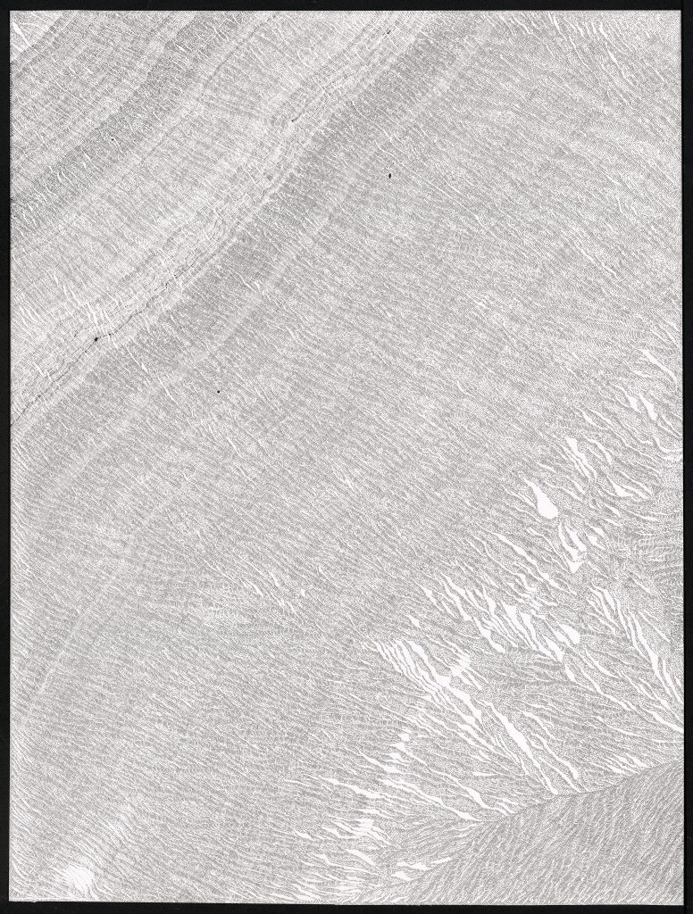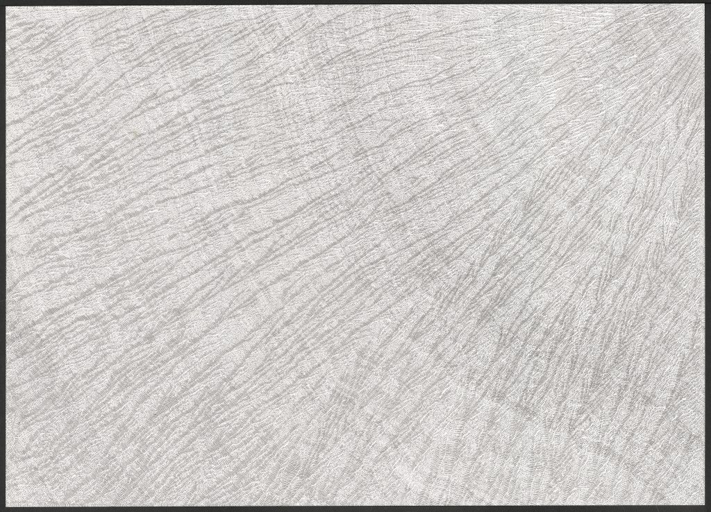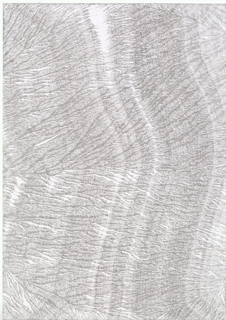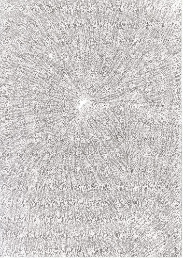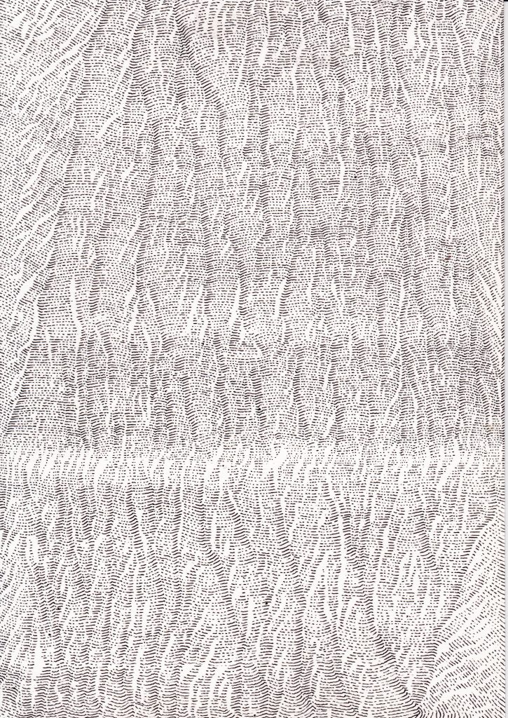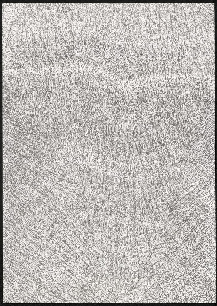 Ce travail est une réflexion sur le temps, une évocation de la mémoire qui est, peut être, plus métaphorique que dans mes autres travaux où je travaille à partir d’archives. Peut être plus poétique aussi.Par le fait de tracer, de suivre la ligne précédente, de répéter ce geste, se créent des mondes dont je n’ai aucune idée de la forme qu’ils prendront. Le résultat apparait sous mes yeux, ces mondes évoquent la nature et sa construction dans les strates du temps (lichens, roches, bois, …).