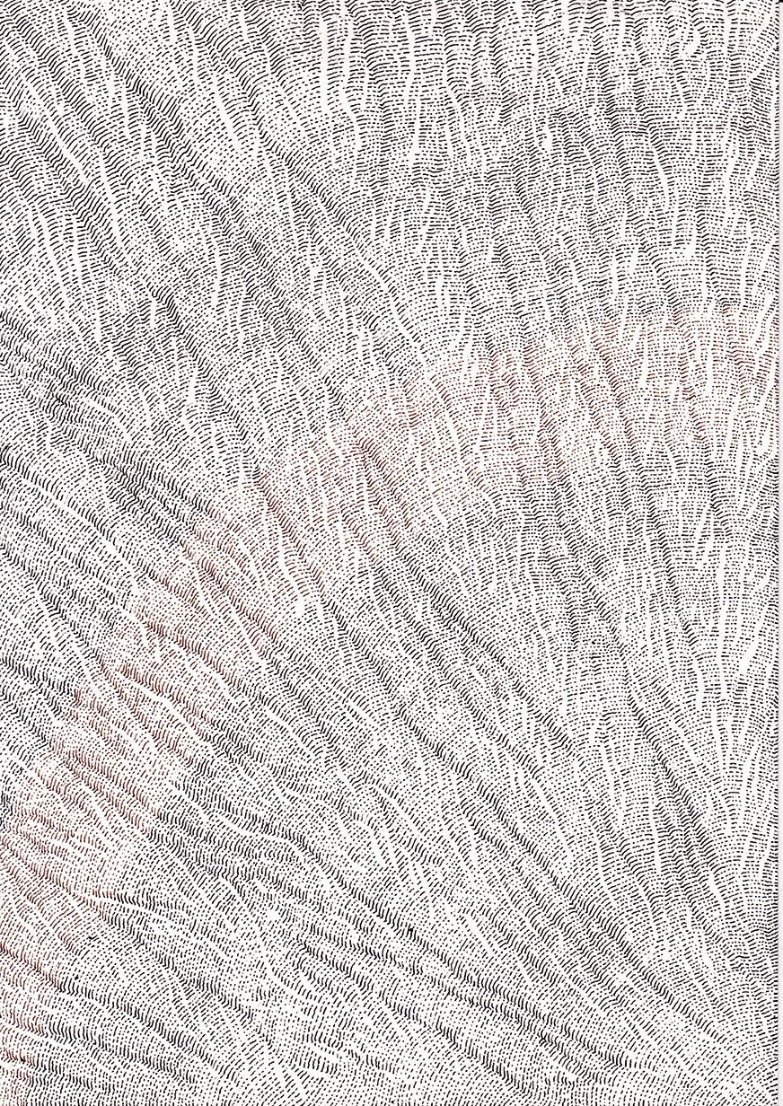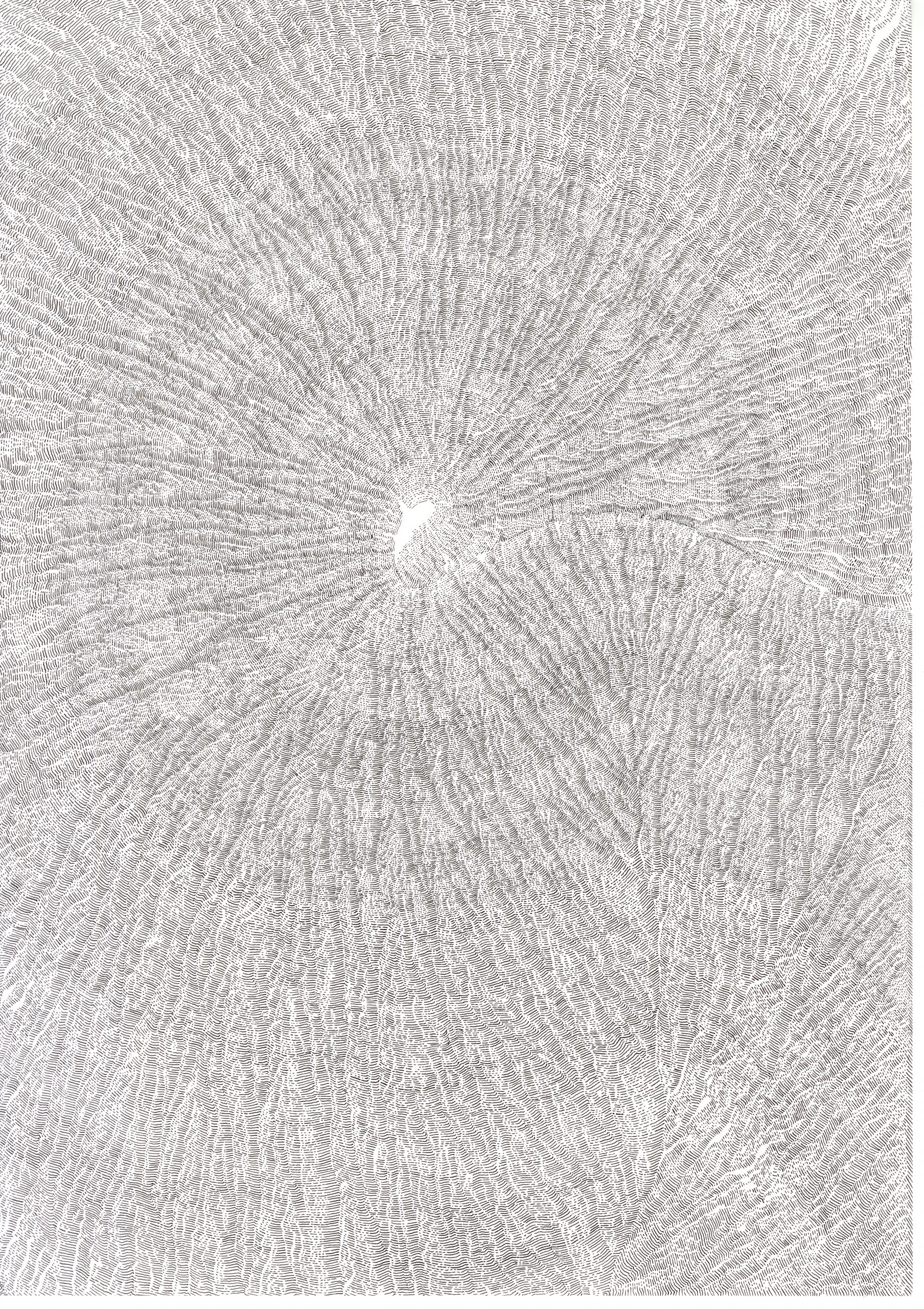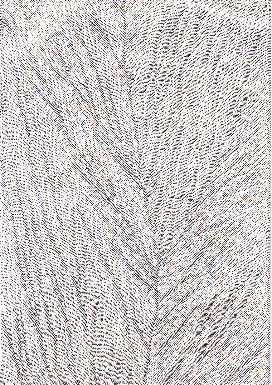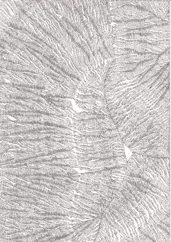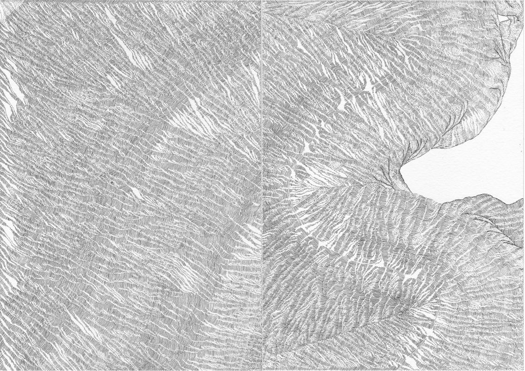 Ce travail est une réflexion sur le temps, une évocation de la mémoire qui est, peut être, plus métaphorique que dans mes autres travaux où je travaille à partir d’archives. Peut être plus poétique aussi.Par le fait de tracer, de suivre la ligne précédente, de répéter ce geste, se créent des mondes dont je n’ai aucune idée de la forme qu’ils prendront. Le résultat apparait sous mes yeux, ces mondes évoquent la nature et sa construction dans les strates du temps (lichens, roches, bois, …).