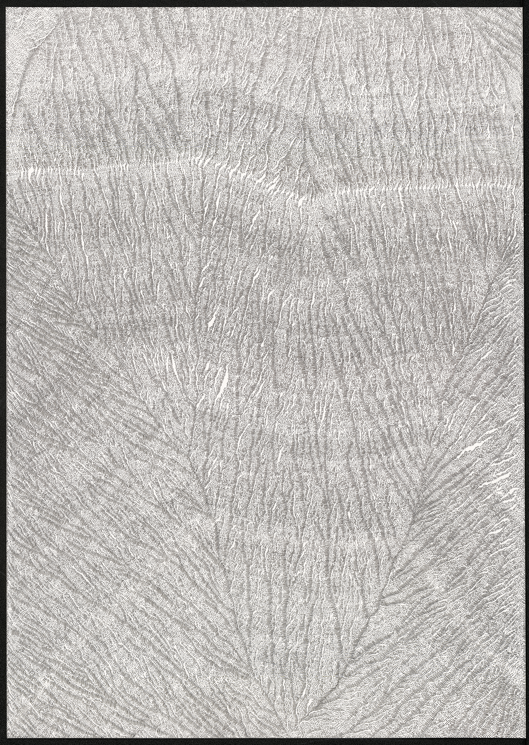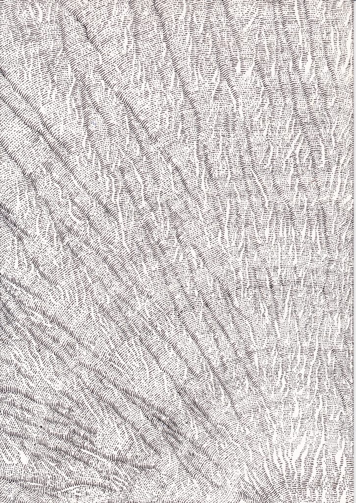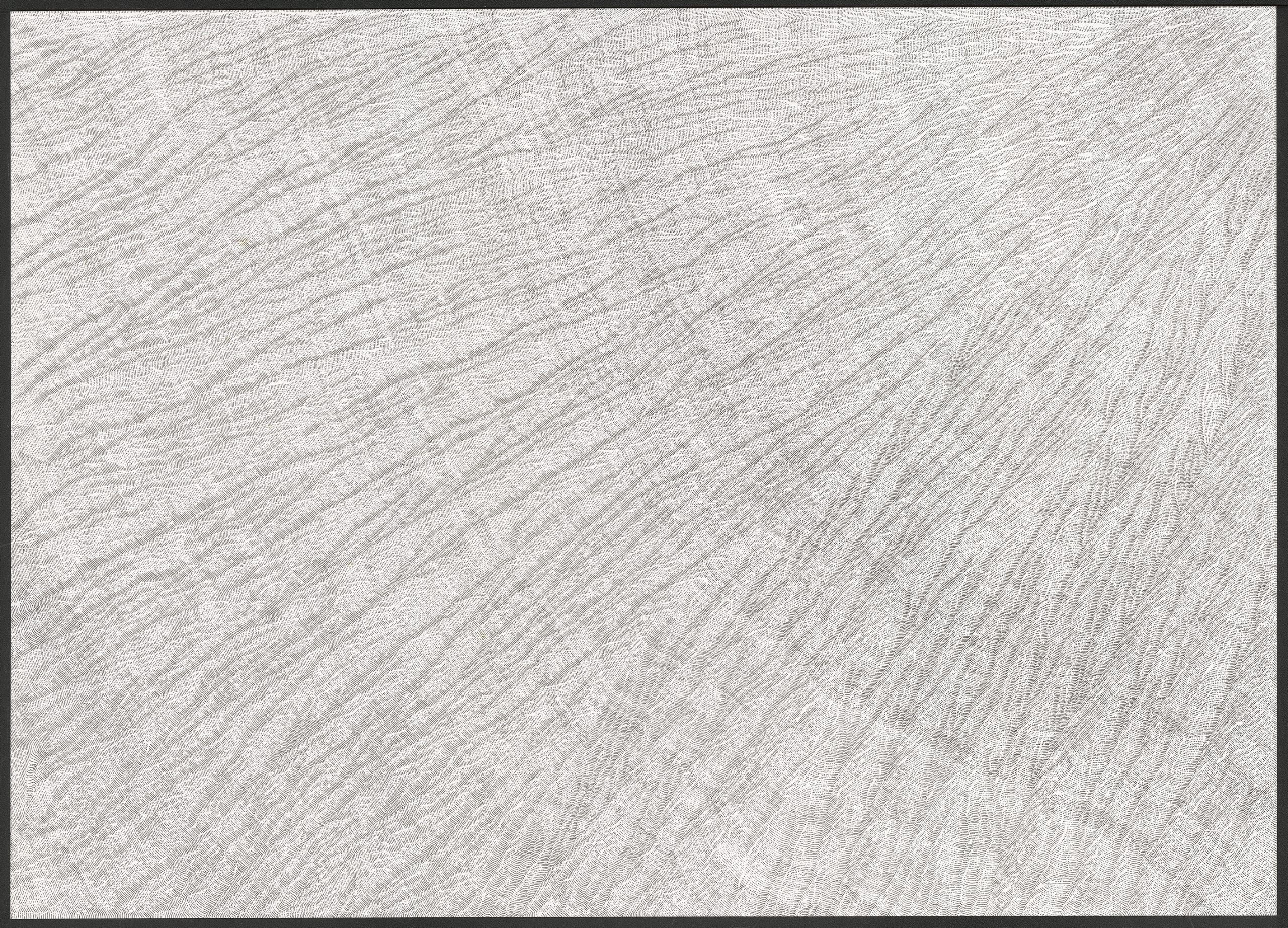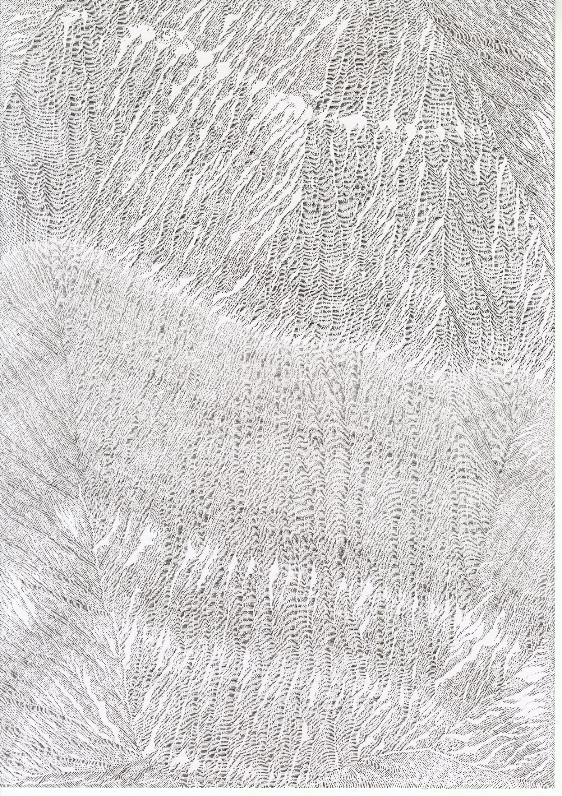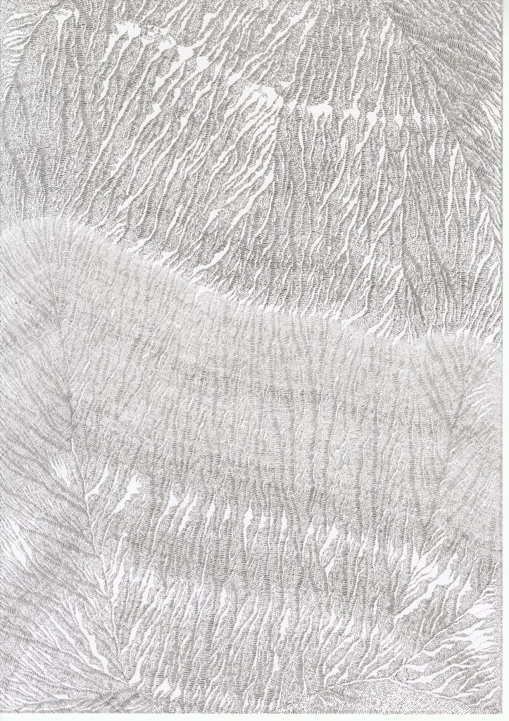 Dans cette série de dessins, le procédé est très simple : Je trace une ligne en effleurant le papier. Puis je tente de suivre la première ligne par une autre, puis une autre, puis une autre, puis encore une autre, … Se créeent alors des territoires graphiques et énigmatiques insoupçonnés.Dans ces dessins, la mémoire y est évoquée par le geste du tracé de lignes. Ils peuvent renvoyer à un monde végétal réinventé et évoqué par le geste de la main. Dans ces dessins, on peut, peut-être, y voir un ensemble de lichens ou la coupe d’une roche, une cavité rocheuse ou une cartographie imaginaire.