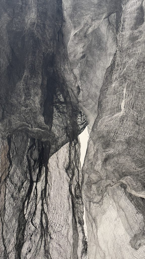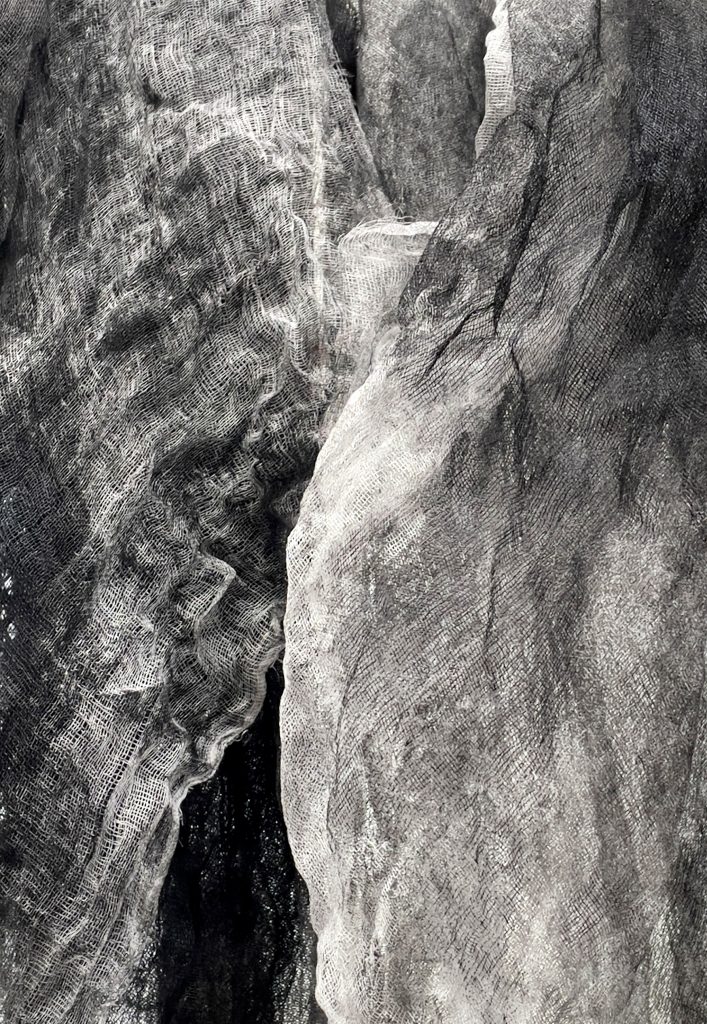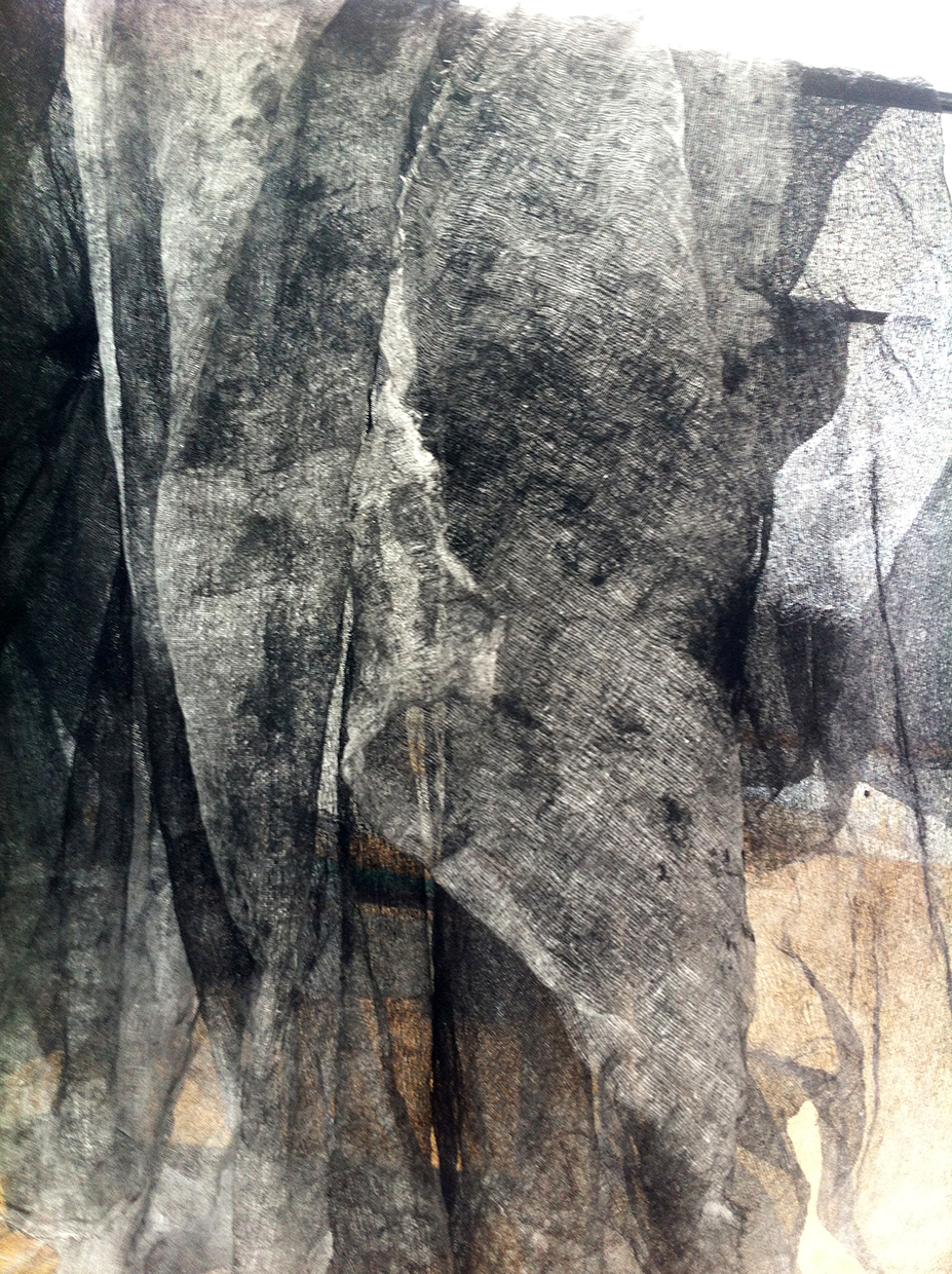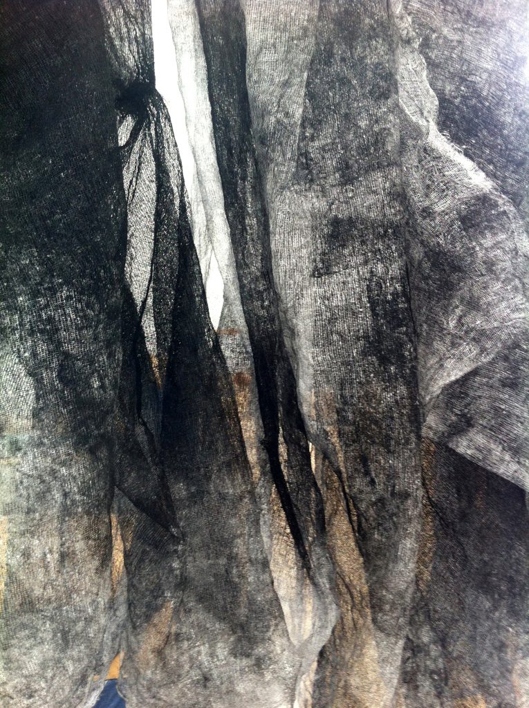 J’ai photographié, en gros plans, des chiffons imbibés d’encre suspendus au-dessus d’une presse pour la gravure.
