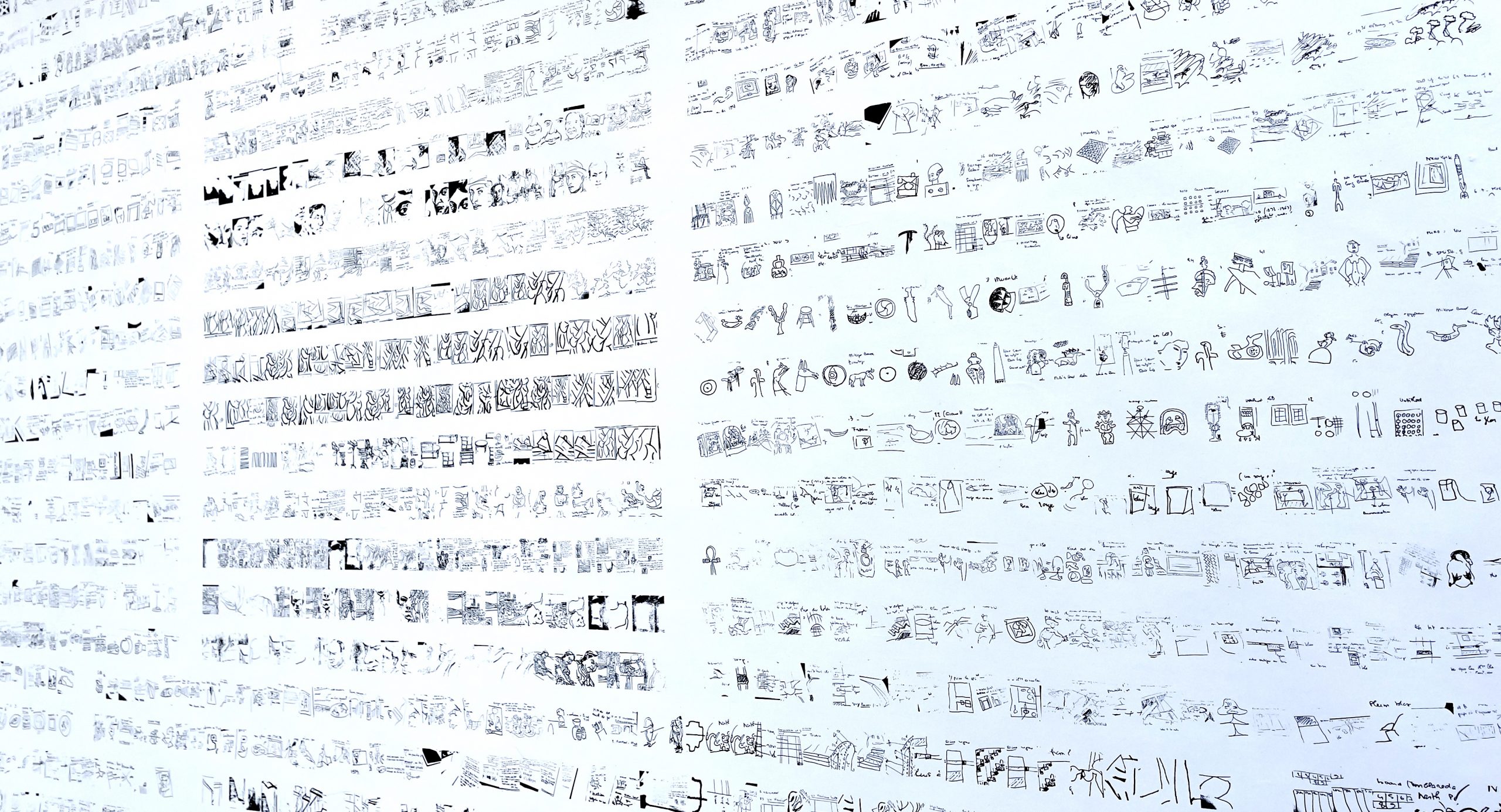 Ce papier peint se compose de photos de dessins relevés dans des carnets d’Hubert Damisch qui m’ont été confiés. Le deuxième ensemble se compose de photos de dessins relevés dans les archives de Meyer Schapiro à Columbia University (par l’historien de l’art Jérémie Koering) dont j’ai re-photographié des détails.